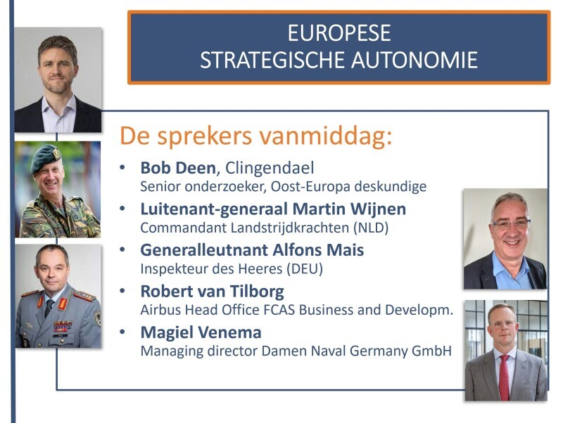 In haar inleiding noemt dagvoorzitter en discussieleider Kol Mietta Groeneveld de ontwikkelingen: de toenemende dreiging van statelijke actoren: de opkomst van China als regelende macht, de expansieve Russische aanloop naar de oorlog met Oekraïne, het negatieve Trump-effect en de invloed van de Covid pandemie. Conclusie: Europa moet nadenken over haar eigen situatie, en of Europa zich een autonoom strategisch beleid kan veroorloven. Vooreerst ligt de binding VS-Europa voorhanden. Het uur van de waarheid kwam al snel. <<<<